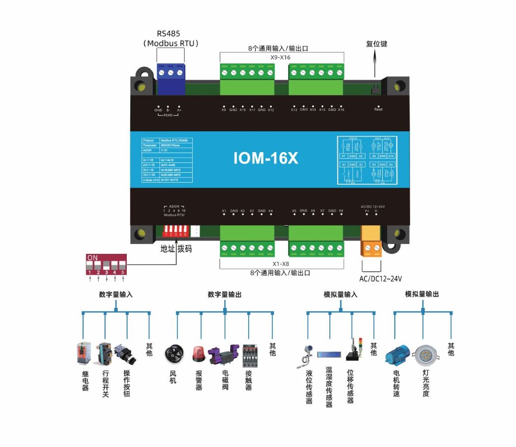 本产品采用主流的ARM核32位微处理器,支持Modbus RTU协议。既可以作为DDC、PLC等控制器的扩展IO模块,也可以单独使用。通用输入输出的设计极大地提高了设备的灵活性,节约成本。